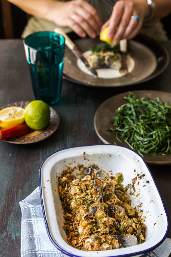 - Line up the filled sardines in a row and drizzle the top with the remaining filling. Sprinkle with some olive oil and bake in the oven for 15-20 minutes.